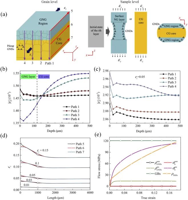 图39 (a)颗粒级和样品级GND堆积模型;(b)弹塑性转变阶段和(c)塑性流动阶段侧向应变εx沿着深度方向的演化(路径1-4),(d)不同拉伸应变下轴向应变εz沿着长度方向的分布(路径5-7),(e)各种影响因素下GS IF钢流动应力的定量评估。