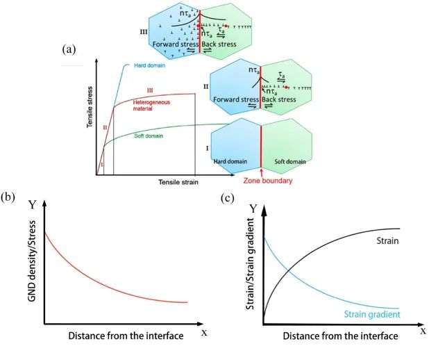 HSMs的变形机制体现为三个阶段:弹性变形阶段,软硬区域均呈弹性状态;弹性-塑性阶段,软区先发生塑性变形,硬区仍为弹性,界面处形成应变梯度,GNDs在软区界面堆积产生背应力,硬区则产生正向应力,二者耦合形成HDI应力,提升屈服强度;塑性阶段,软硬区均塑性变形,软区承受更高应变,应变分配效应促使更多GNDs积累,产生HDI硬化,使应变硬化率显著提升。
