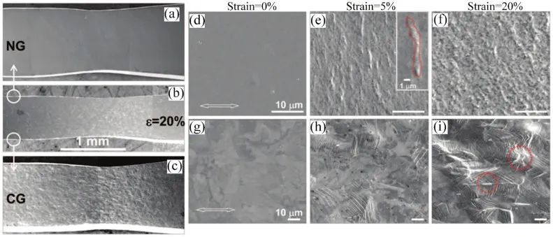 图35 (a)NG层、GNG-Cu样品和CG层在20%拉伸变形后的SEM图像,其中NG和CG层为取自GNG-Cu样品的750µm厚的薄箔拉伸试样;(d-f)和(g-i)NG和CG层分别在0%、5%和20%拉伸应变下的表面形貌。