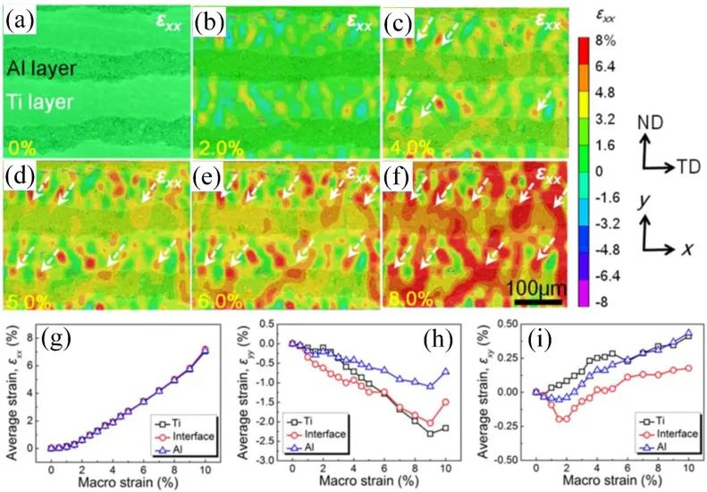 图29 LS Ti-Al层压板在不同宏观应变下沿着x方向的基于SEM的DIC映射:(a)0%,(b)2.0%,(c)4.0%,(d)5.0%,(e)6.0%,(e)8.0%;随着宏观应变增加的平均应变的定量分析:(g)εxx,(h)εyy,(i)εxy。