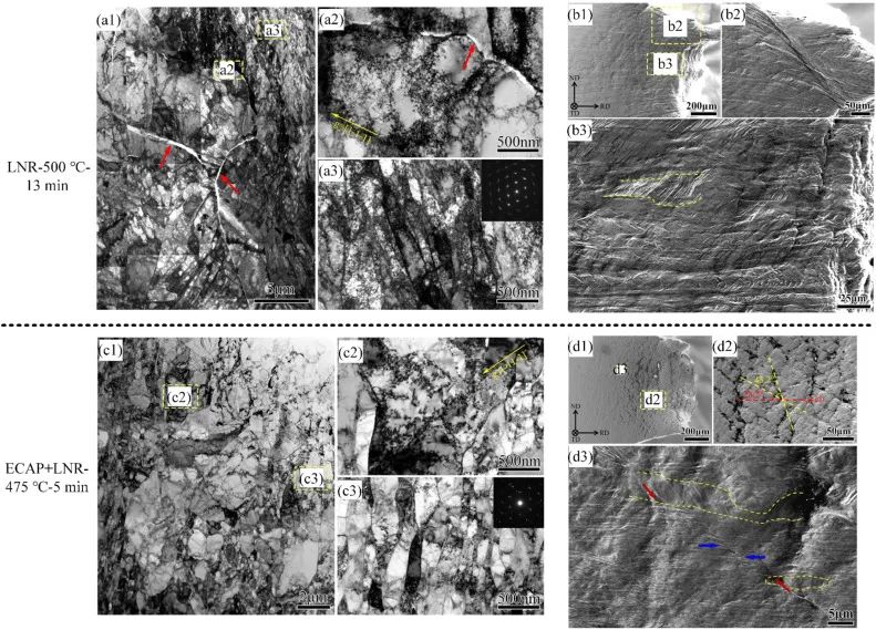 图31 两种HLS Ni:(a1-a3)LNR-500℃-13min样品的TEM图像,在颈缩处具有高密度位错结构的层状CG嵌入基体中;(b1-b3)LNR-500℃-13min样品的断口的SEM图像;(c1-c3)ECAP+LNR-475℃-5min样品的TEM图像,在颈缩处具有等轴CG嵌入UFG基体中;(d1-d3)ECAP+LNR-475℃-5min样品中断裂的SEM图像。