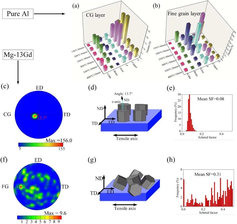 图20 LS纯Al中的织构统计:(a)CG层,(b)FG层;HLS Mg-13Gd合金中的极图、晶体取向模型和施密特因子(SF)分布:(c-e):CG,(f-h)FG。