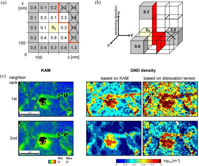 (b)基于位错张量的方法,其中晶界以红色突出显示。