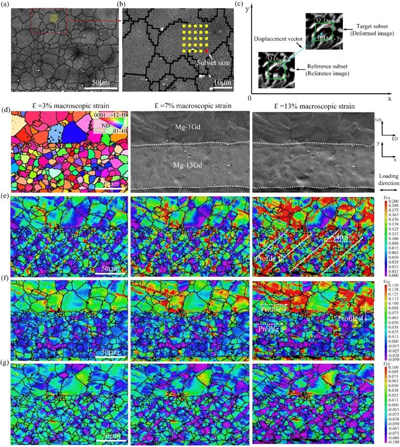 图 27(a)显示散斑图案和晶界(黑线)的扫描电镜图像,(b)(a)中红色虚线框标记区域在2000倍放大倍数下的图像,红色方框显示子集大小,(c)数字图像相关法(DIC)基本原理示意图,(d)在3%宏观应变下通过电子背散射衍射(EBSD)获得的Mg-1Gd/Mg-13Gd样品的逆极图(IPF)以及在7%和13%宏观应变下对应的高分辨率扫描电镜图像,(e–g)不同宏观应变下高分辨率数字图像相关法(HR-DIC)得到的应变场εxx、εxy和εyy。