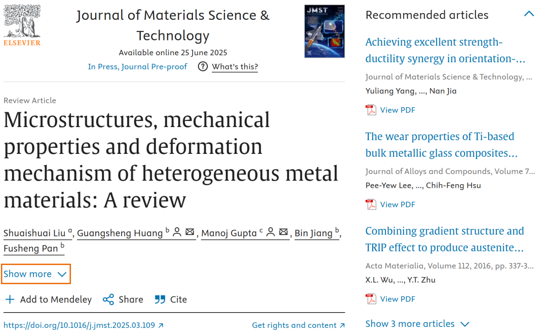 相关研究成果以“Microstructures, mechanical properties and deformation mechanism of heterogeneous metal materials: A review”发表在Journal of Materials Science & Technology上