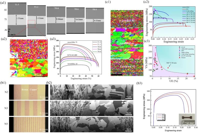 (a3)Al/Ti/Al层压板、单个Ti和单个Al的工程应力-应变曲线。(b1)LS铜/青铜层压板的OM图像(N2、N3、N5样品)通过ARB处理2、3和5个循环并结合退火。