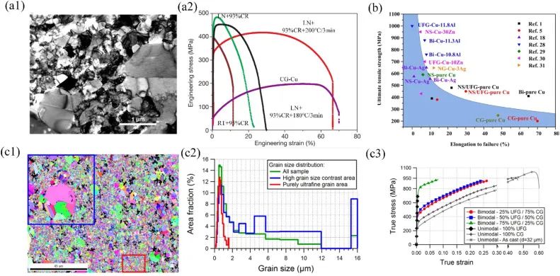 图26 三个样品的EBSD图像、晶粒尺寸的统计分布和DIC图像:(a1-a3)轧制UFG样品,(b1-b3)含~30%CG的BS样品,(c1-c3)均质CG样品。