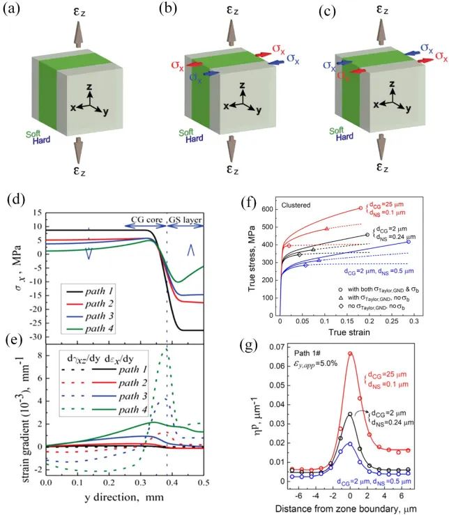 (d)沿着x轴的法向应力(σx)分布。(e)沿着x轴的法向(dεx/dy)和剪切(dγxz/dy)应变梯度。路径1(中心)至4(边缘)是指为CPFEM建模选择的样本的不同路径;非均质Cu的CPFEM分析作为模型,并考虑不同变形机制的强度贡献。