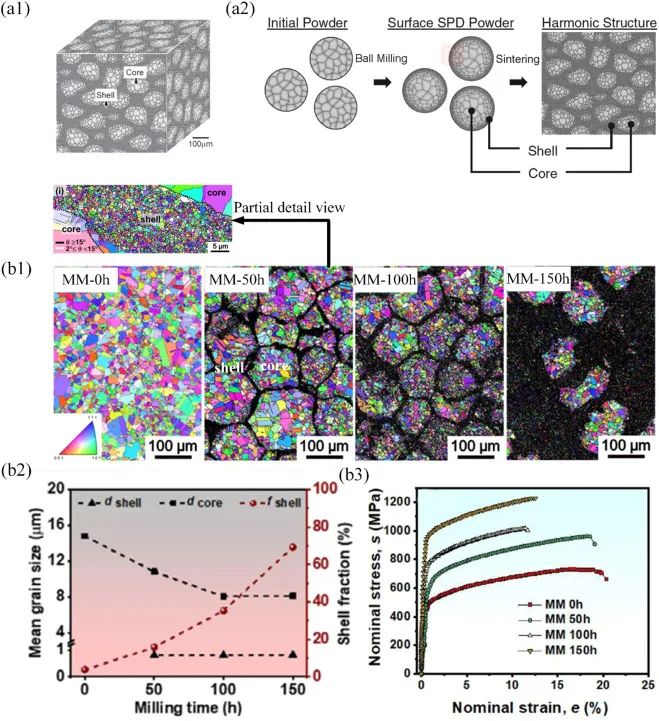 (b1)GS IF的一个GS层中的模型图和粒度分布-用SMAT方法加工的具有两层GS层包裹CG芯的钢板样品。