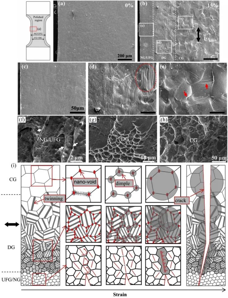 图34 GNG-Ti横截面的SEM图像:(a)拉伸变形前,(b)15%拉伸变形后;(c-e)图(b)中标记的NG/UFG到CG的高倍放大图像;(f-h)相应的断裂形貌;(i)损伤演化和断裂的模型图。