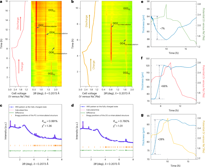 锂离子电池(LIBs)和钠离子电池(SIBs)通常依赖嵌入反应,锂离子或钠离子储存在电极的层状结构中,并在充放电过程中进行交换。电极由液态电解质隔开,电解质中离子被溶剂分子包裹形成溶剂化壳层。离子从电解质嵌入电极时需要脱去溶剂化壳层,反之,离子从电极脱出时会重新溶剂化。在某些情况下,溶剂化壳层未完全剥离,导致溶剂分子也一起嵌入电极,这种现象称为共嵌入(离子和溶剂分子共同嵌入)。共嵌入通常被认为是不利的,因为它会导致电极材料的劣化。 在现有的锂离子电池中,固态电解质界面(SEI)层有效阻止了溶剂的共嵌入。然而,共嵌入反应有时表现出高度可逆性和快速动力学,甚至能够持续数千次循环。其中典型例子是钠离子和二甘醇醚(diglyme)在石墨电极中的共嵌入反应。值得注意的是,溶剂共嵌入为设计电极反应提供了独特机会。例如,溶剂成为电极反应的一部分,能够有针对性地调控电极电位,调节幅度可达几百毫伏,具体取决于共嵌入的溶剂类型。另一个优势是通常限制嵌入反应速率的溶剂壳层剥离能量,在共嵌入过程中可被降低甚至绕过,从而提升能量效率和速率性能。 特别值得注意的是,尽管溶剂化钠离子的体积更大,但其在石墨中的扩散速率快于锂离子。共嵌入的缺点是溶剂化离子尺寸较大,会导致电极体积膨胀幅度更大,同时在石墨中比传统嵌入过程的比容量降低超过三分之二,影响能量密度。此外,需要过量电解质也是实际应用中的挑战,但通过优化电解质和电极,有可能减少电解质用量,例如避免在SEI形成过程中的不可逆电解质消耗。 虽然大多数共嵌入研究集中于石墨负极,但共嵌入在正极活性材料(CAMs)中的研究非常有限,且对于其在电池中的性质和可行性认识不足。近期研究表明,钛二硫化物(TiS2)能够共嵌入钠离子和二甘醇醚分子。另有研究显示,TiS2在高温条件下可以实现Mg2+和Ca2+与碳酸丙烯酯(PC)的共嵌入,但循环性能依然面临挑战。尽管这些研究推动了新型电极反应的探索,TiS2本身并非真正意义上的正极活性材料,因为其不含钠或其他碱土金属离子,难以从商业角度实现电池在放电态的组装。 鉴于此,德国柏林洪堡大学Philipp Adelhelm团队在“Nature Materials”期刊上发表了题为“Solvent co-intercalation in layered cathode active materials for sodium-ion batteries”的最新论文。本文针对一系列NaxMS2(M为Ti、V、Cr及其混合物)化合物,使用不同溶剂(包括二甘醇醚、碳酸丙烯酯以及碳酸乙烯酯/碳酸二甲酯混合溶剂)系统研究了钠离子的溶剂共嵌入反应。作者证明了钠离子在CAMs中的共嵌入现象,并揭示了一种溶剂和离子相反流动的反应机制。在理论计算和实验验证的指导下,提出了基于层间结合能和层间自由体积的模型,来预测层状CAMs中的溶剂共嵌入行为。共嵌入的表现由相结构、钠含量、过渡金属及阴离子种类以及溶剂性质共同决定。 (1)实验首次系统研究了钠层状硫化物正极活性材料NaxMS2(M=Ti、V、Cr及其混合物)中钠离子与多种溶剂的共嵌入现象,得到了不同条件下共嵌入对材料相变、电极膨胀、氧化还原电位和循环性能的影响规律。 (2)实验通过结合多种溶剂(包括二甘醇醚、碳酸丙烯酯及碳酸乙烯酯/碳酸二甲酯混合溶剂)与NaxMS2正极材料进行电化学测试和结构分析,发现共嵌入过程中存在溶剂与钠离子相反方向的通量;通过理论计算与实验验证,提出了层间结合能与层间自由体积模型,能够有效预测共嵌入行为。 (3)共嵌入不仅改变了材料的层状结构和溶剂化离子含量,还导致电极体积膨胀加剧,同时调控了电极的氧化还原电位。此外,共嵌入能够绕过离子脱溶剂化的能量障碍,提高了反应动力学和循环稳定性。这些发现为设计结构多样、性能可调的钠离子电池正极材料提供了新的思路和理论指导。 图1. P2-NaₓTiS₂的电化学行为 图2. PC和2G基电解液中因共嵌入导致的大晶格膨胀 图3. 层状硫化物正极中溶剂共嵌入的机制 图4. 层状硫化物和氧化物的层间结合能与层间自由体积 图5. 其他层状硫化物中的溶剂共嵌入 本文系统揭示了溶剂共嵌入作为一种调控钠离子电池正极活性材料性能的新机制,突破了传统仅关注离子单独嵌入的研究视角。研究发现,溶剂分子不仅能与钠离子共同进入层状结构,而且在特定条件下溶剂与离子呈现相反的物质通量,这种复杂的嵌入行为对材料的相变、结构稳定性及电化学性能产生深远影响。通过理论计算与实验验证,建立了层间结合能与自由体积相结合的模型,能够有效预测不同材料与溶剂体系中的共嵌入倾向,指导未来电极材料的设计和优化。此外,溶剂共嵌入可实现电极反应电位的精准调控,降低嵌入过程的能量障碍,从而提升电池的能量效率和充放电速率。该机制不仅为钠离子电池领域开辟了新的研究方向,也为开发结构多样化、性能优异的层状电极材料提供了理论基础和技术路径,推动了高性能、长寿命电池的创新发展。未来结合溶剂分子设计与电极材料调控,将极大丰富电池体系的功能与应用潜力。