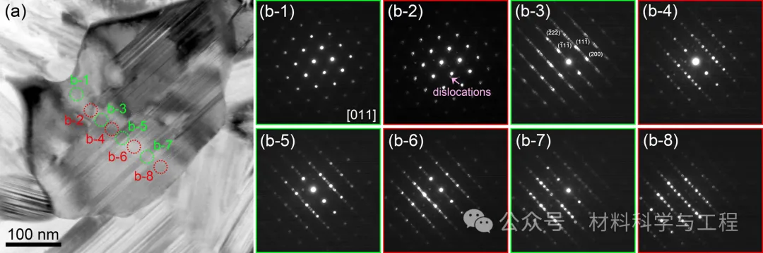 Fig. 4. κ相中高密度的层错导致局部相转变为 9R 和 HCP 结构:(a) 未变形的 UST3 样品的明场像;(b-1) 至 (b-8) 一系列纳米束电子衍射图样,每个探针直径约为 20 nm,位于 (a) 中κ相的横向位置。