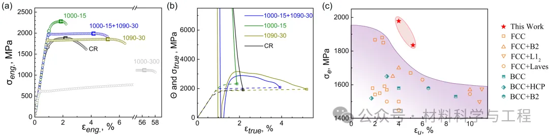 Fig. 2. 超短时热处理对VCoNi样品力学性能的影响: (a) 工程应力-应变曲线;(b)真应力-应变曲线 (σtrue) 和加工硬化曲线 (Θ);(c) 本文中VCoNi合金与类似工艺M/HEA的力学性能对比。