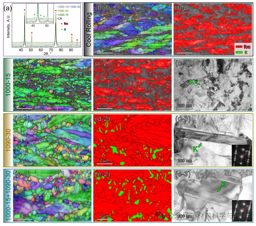 Fig. 3. VCoNi合金在各种超短时热处理条件下的微观组织演变:(a) 冷轧样品和超短时退火样品的 XRD相分析,其中红色圆形表示 FCC 衍射峰, 绿色菱形表示κ相衍射峰;(b-1) 和 (b-2) 为冷轧样品的IPF和相图;(c-1), (c-2), 和 (c-3) 为UST1 样品的IPF、相图和 TEM 图像;(d-1), (d-2), 和(d-3) 为UST2 样品的IPF、相图和 TEM 图像;(e-1), (e-2), 和(e-3) 为UST3 样品的IPF、相图和 TEM 图像。