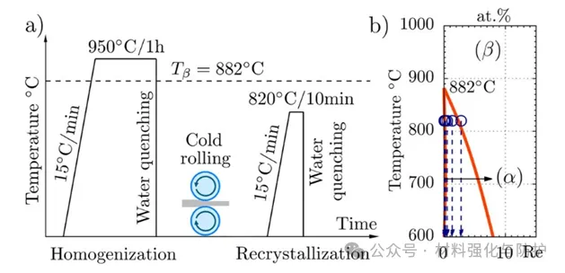 研究团队以纯Ti为基体,系统研究了0.1至10 wt.% Re含量的Ti–Re合金,通过熔炼、热处理(950 ℃均匀化1 h)、冷轧与820 ℃再结晶处理10 min等步骤制备微观结构均一的等轴再结晶组织,热处理冷却方式均为水冷,并结合DFT计算对β相的稳定性与力学性能进行原子尺度解析。