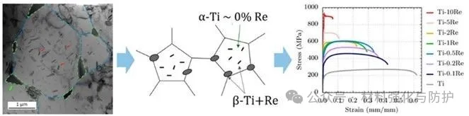 通过XRD、EBSD与TEM分析研究揭示,在Re添加量为0.1–0.5 wt.%区间时,材料内部形成两类β相:一类为晶粒内部的细长条状纳米β析出物,另一类为晶界上的楔形β粒子,其结合晶粒尺寸的急剧减小(从80µm降至4µm),实现了位错运动的强烈抑制与应变硬化能力的保持。