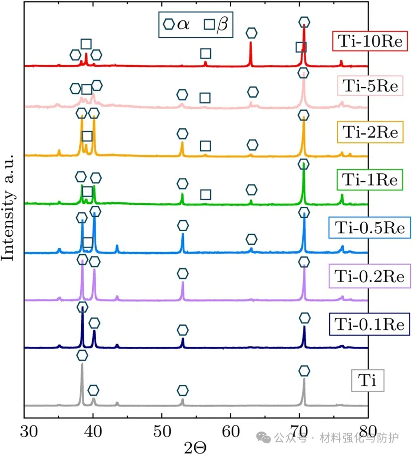 纯Ti和Ti-Re合金在再结晶状态的XRD结果