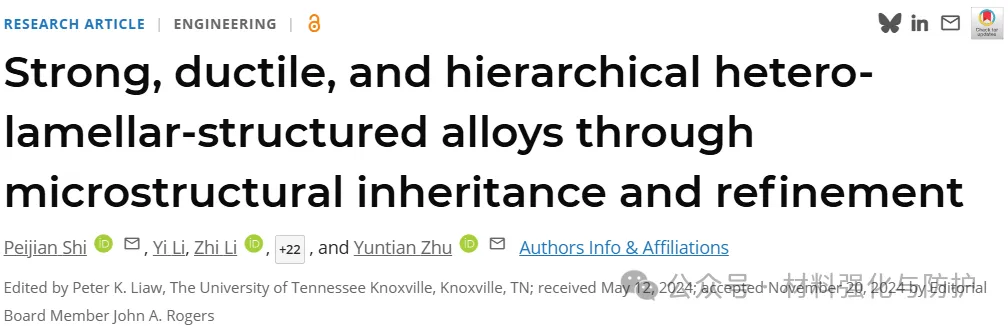 由上海大学时培建教授为第一兼通讯,香港城市大学刘锦川院士,清华大学高华健院士、香港城市大学朱运田院士和上海大学钟云波教授为通讯作者,以及北京大学、北京科学智能研究院、新加坡科技研究局高性能计算研究院、香港大学与香港科技大学等多家重磅单位的研究人员,强强联合组成的豪华团队,在《PNAS》期刊发表了题为“Strong, ductile, and hierarchical hetero-lamellar-structured alloys through microstructural inheritance and refinement”的研究论文,该工作创新性提出了一种基于组织继承与快速热处理的层级异质结构设计策略,在仅需10分钟退火的条件下,即实现了超越以往复杂处理工艺的强度-延展性协同性能极限,为高性能结构材料的快速制备提供了新的范式。