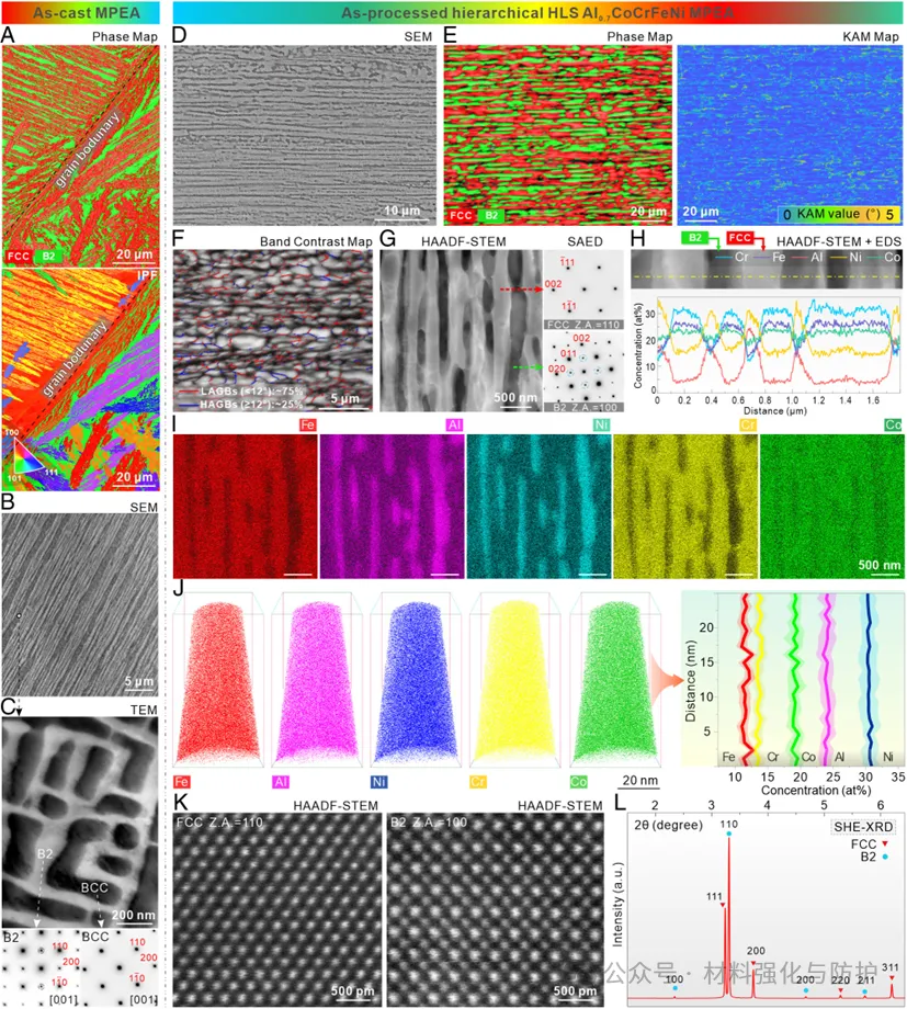 作为典型的三相多主元合金体系之一的Al0.7CoCrFeNi合金,其在铸态下会在自发形成FCC/BCC/B2三相层片结构,团队将这一结构特征作为结构基础,采用定向冷轧工艺使原始的层片结构沿轧制方向(RD)拉伸并在厚度方向(TD)实现晶粒细化和亚结构的引入。轧制后的样品在1000℃下退火10min后内部发生再结晶,得到了一种多尺度协同存在的HLS结构。