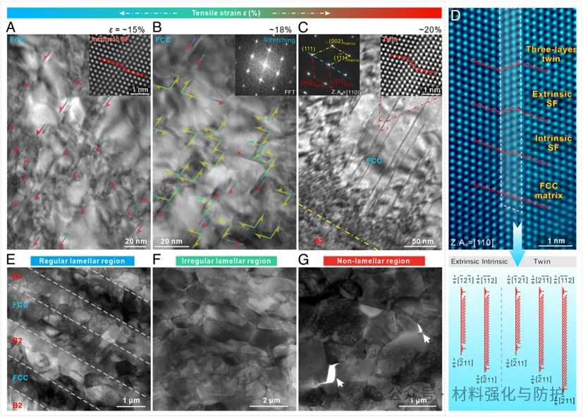 HLS结构中产生了高达610MPa的异质变形诱导(HDI)应力,不仅在FCC相中形成大量位错堆积、层错与纳米孪晶,更在B2相中激发出<111>型滑移系,显著改善了其本征脆性问题,这种多尺度和多机制的协同作用共同赋予了材料的高应变硬化能力和塑性。作者基于第一性原理计算还证实了该合金体系中FCC相的层错能高达3 mJ/m²,理论上并不容易发生孪生,但由于高HDI应力的推动,仍成功激发了大规模的纳米孪晶行为。