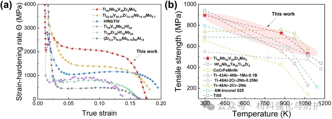 团队设计的Ti40Nb30V20Zr5Mo5合金在室温下表现出867MPa的屈服强度与26%左右的延伸率,并在1073K的高温下仍保持超过500MPa的抗拉强度,这样优异的性能组合来源于Mo的引入,团队发现,Mo能够显著增加晶格模量错配和不均匀原子应变场,同时促使位错在滑移过程中更易发生交滑移与缠结,最终表现为在合金内构建更为复杂的位错亚结构网络。