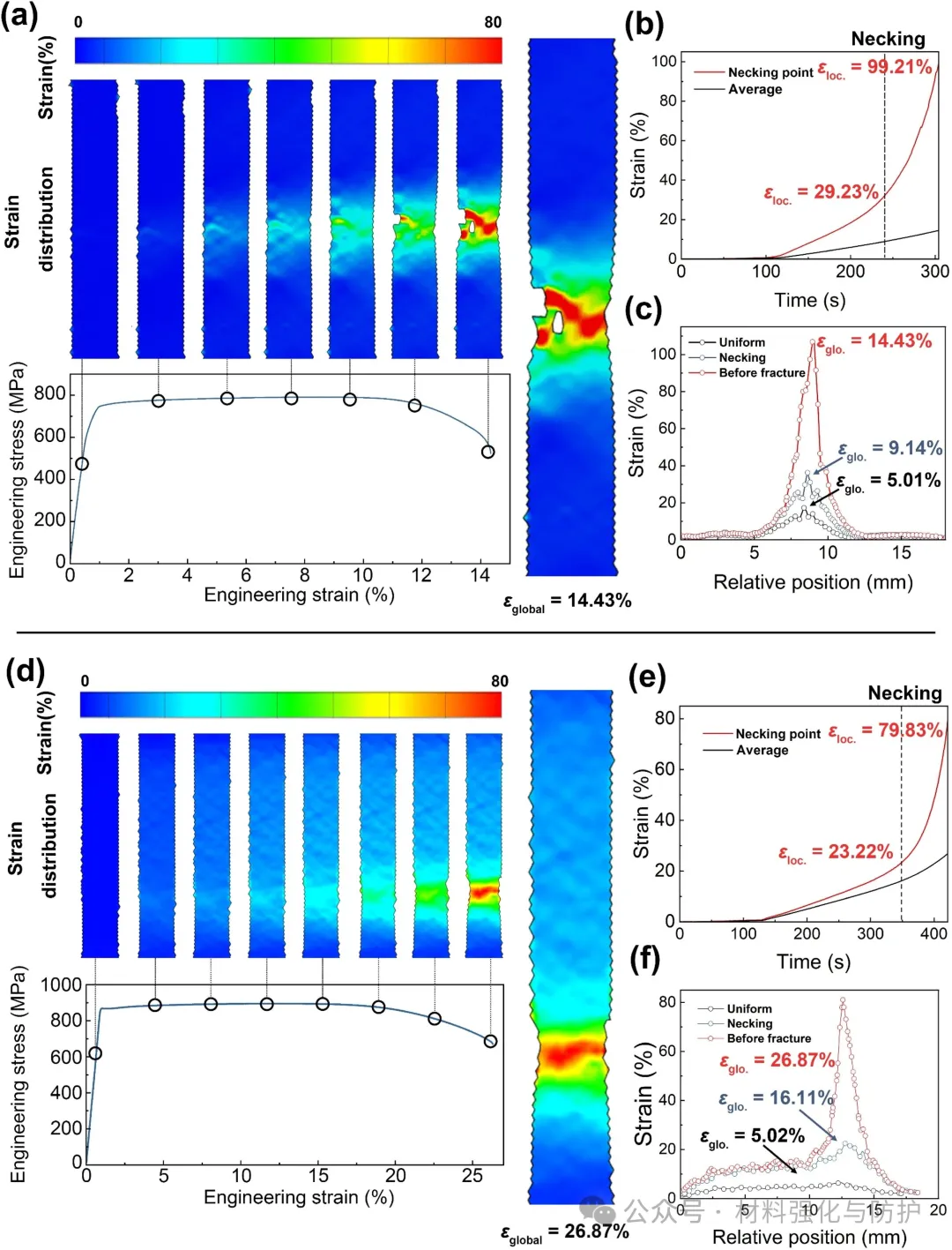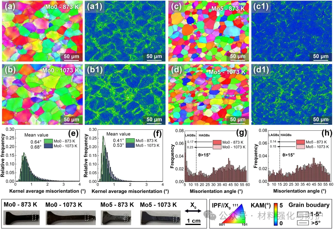 Mo元素的引入协同提升了合金的强塑性,Mo5在室温下的屈服强度比Mo0提高了20%,达到了867MPa,同时延伸率提高至25%左右,应变硬化速率稳定保持在约2GPa,Mo5在拉伸过程中应变分布更加均匀,相比Mo0有效延缓了局部颈缩的发生。
