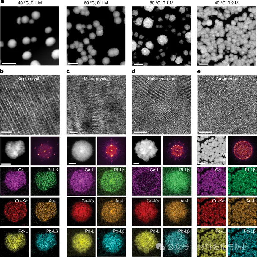 该研究通过调整反应温度和金属盐浓度,可得到单晶、介晶、多晶甚至是非晶结构,如40℃-0.1M的条件下能生成高结晶度单晶,而80℃时可以形成多晶。该方法不仅能合成含Ga的高熵合金,还能让Ga完全消耗掉得到无Ga的产品。