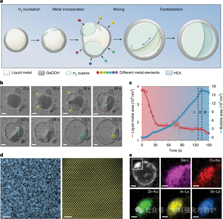 反应中Ga与溶液里的H⁺反应生成H₂纳米气泡,这些气泡会带动液态金属内部循环流动,相当于充当了“隐形搅拌器”,大幅加速金属元素混合。同时,凝固过程中还存在“振荡凝固”,晶体结构在结晶态与非晶态间快速切换,这种动态过程能有效保留高熵状态,避免元素分离。