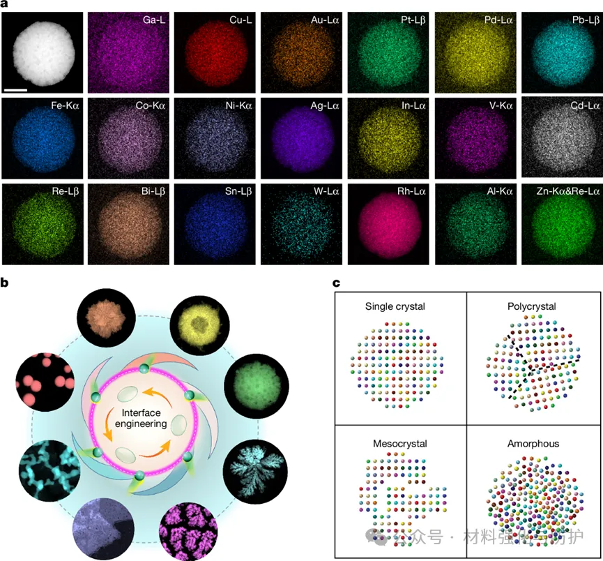 该研究提出了一种等温凝固新策略,该方法以Ga基液态金属为介质,在25-80℃低温下通过液-液界面反应合成高熵合金(HEAs),能够精准调控HEAs的结晶度,可最多熔入20种元素和制备0-3维形态,突破了传统的合成局限,为HEAs应用奠定基础。