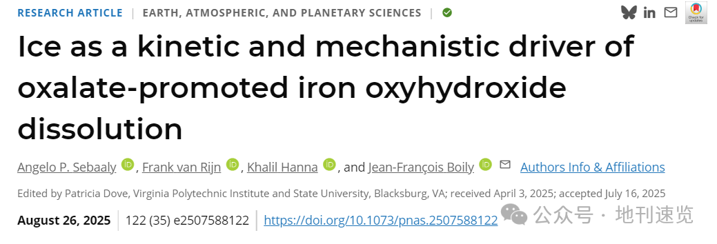 《美国国家科学院院刊》近期发表的一项研究,通过实验模拟,探究了冰冻环境中氧化铁纳米矿物的溶解过程。研究发现,冰并非惰性物质,而是一个高效的化学反应器。结冰过程会将矿物、有机物和酸性物质浓缩在冰晶间的微型液态水中,这种“冰冻浓缩效应”极大地促进了铁的溶解。这一发现为理解永久冻土、酸性土壤等冰冻环境中铁的迁移提供了关键机理,并有助于解释气候变化加剧的冻融事件如何向自然界释放更多可溶性铁。 当我们想到冰,脑海中浮现的往往是静止与封存的景象。然而,最新的科学研究揭示了一个令人惊讶的事实:在冰冷的、看似沉寂的世界里,冰本身就是一个高效的化学反应器,能够以前所未有的方式驱动化学变化。这一发现对于理解全球气候变化如何影响地球的生态系统至关重要,尤其是在解释北极(Arctic)地区河流为何出现“生锈”现象等问题上。铁是地球上一种至关重要的元素,是无数生命过程的基础。在自然界中,大部分铁以不溶于水的矿物形式存在,例如针铁矿。生物体要想利用铁,必须先将其转化为可溶性形态。传统上,我们认为这一转化过程在温暖的液态水中更为活跃。但一项新研究彻底颠覆了这一认知,它聚焦于冰冻环境中铁的溶解过程。 研究人员发现,当含有微小针铁矿颗粒、有机物(如广泛存在于土壤中的草酸盐)和酸性物质的水开始结冰时,一个奇妙的过程便发生了。纯净的水分子会优先形成冰晶,而水中的杂质——矿物颗粒、草酸盐和带来酸性的质子——会被排挤到冰晶之间尚未冻结的微小液态水区域中。这个过程被称为“冰冻浓缩效应”。它将原本分散在大量水体中的反应物,高度集中在这些冰晶间的微型液态“口袋”里。浓度急剧升高,极大地加速了化学反应的速率。在这种高度浓缩的酸性环境中,草酸盐能更有效地从针铁矿表面“抓取”铁离子,使其溶解进入液态水中。这个过程甚至在零下30°C的低温下依然能够进行。 在某些条件下,冰的“工作效率”甚至超过了温暖的液态水。实验数据显示,在高浓度有机物存在时,零下10°C的冰溶解的铁比4°C的液态水还要多;而在低浓度有机物条件下,其溶解的铁甚至超过了25°C的液态水环境。这表明,冰冻浓缩带来的反应增强效应,完全压倒了低温导致的反应速率减慢效应。 此外,研究还揭示了其他关键因素的影响。例如,高盐度(类似海水)会抑制铁的溶解,因为盐分析子会与有机物竞争矿物表面的反应位点。而反复的“冻融循环”则会进一步促进铁的释放。每一次融化都会让之前被锁在冰晶内部、未能参与反应的有机物重获自由,待下一次结冰时,这些“生力军”便会加入到新一轮的浓缩反应中。 这些发现有助于我们理解全球广阔的冰冻圈(Cryosphere)中的地球化学过程,无论是酸性硫酸盐土壤、大面积的永久冻土(permafrost),还是悬浮在大气中的尘埃气溶胶。例如,飘浮到极地海洋上空的含铁尘埃在冰冻的云层中,可能会通过这一机制释放出更多可溶性铁,从而影响海洋的初级生产力。随着全球气候变暖,冻融循环日益频繁,永久冻土加速融化,这一由冰驱动的铁释放机制正变得愈发重要。它有助于解释为何在融雪和冰川融化期间,我们会在自然流域中观测到可溶性铁通量的增加。这项研究不仅揭开了冰封之下隐藏的化学奥秘,更为我们评估气候变化对地球元素循环和生态系统健康的影响,提供了宝贵的科学依据。 文章链接:https://doi.org/10.1073/pnas.2507588122 (2025)