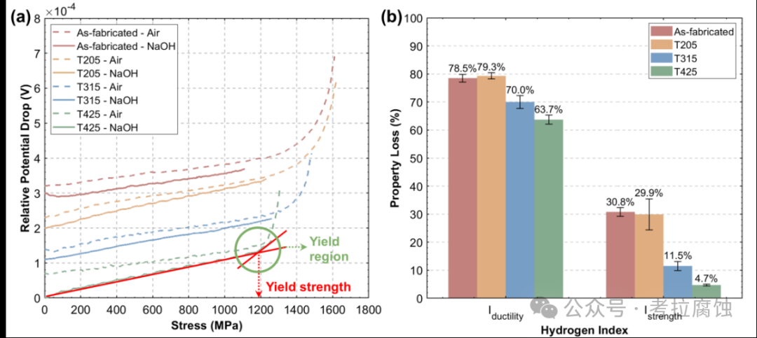 结果表明,在氢环境中回火 425 ℃ 的样品仍保持约 1200 MPa 的屈服强度,仅表现出 5% 的抗拉强度下降和 64% 的延伸率下降,性能远优于未经回火的样品。该研究强调了氢陷阱特征在氢脆机理中的核心作用,并为 AM 高强度钢的热处理优化提供了新的思路。