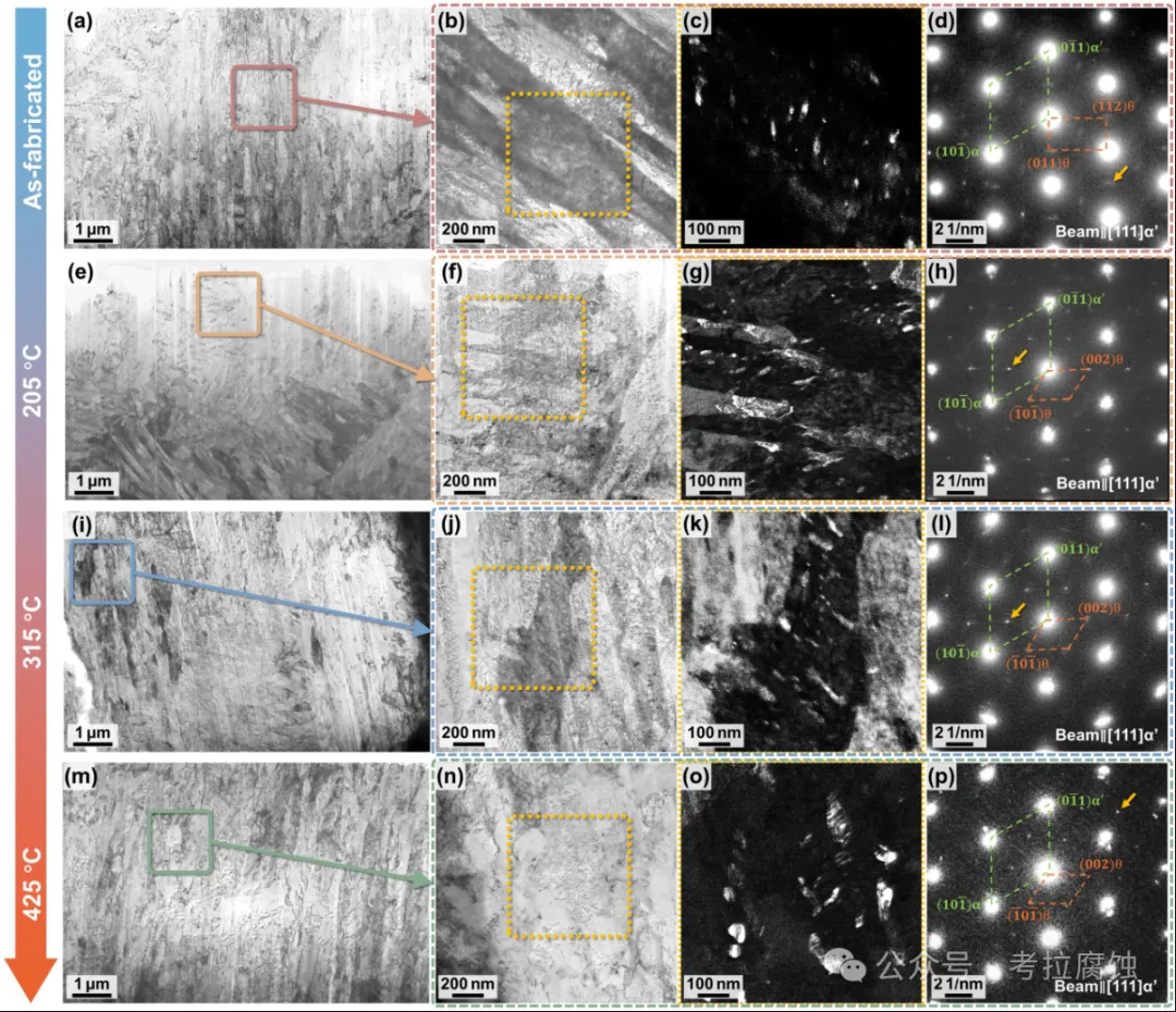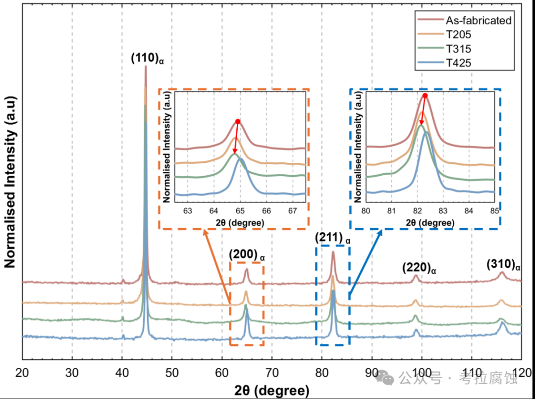 图4. 展示了经降噪处理的XRD光谱,结果表明所有试样在相组成上均无显著差异。主要相为α-铁素体。值得注意的是,与其他测试试样相比,T425试样呈现更窄更锐利的衍射峰,表明其晶体缺陷更少且微观结构恢复程度更高。放大观察图4中62.5°至67.5°及80°至85°间的峰值可见,T205和T315试样相较于原始试样及T425试样,其峰位显著向低角度偏移(如图中红箭头所示)。这种向低角度的偏移可归因于205℃和315℃回火过程中残余应力释放导致的晶格膨胀。相反,425℃回火促进了更广泛的碳化物析出,从而降低了贝氏体铁素体中的碳过饱和度,进而减小晶格参数并使衍射峰重新偏移至高角度。