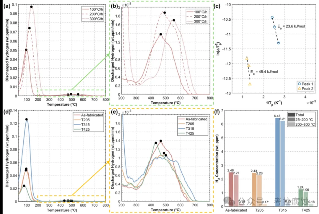 图3所示的TDS结果揭示了增材制造的4340钢中存在显著的氢捕获行为差异。低温脱附峰(图3d)普遍存在于所有试样中,对应扩散氢在弱可逆位点(如位错、低角晶界、空位及各类碳化物与相界面的结合处)的捕获。高温峰(图3e)出现在200°C以上,归因于不可逆捕获位点,如高角晶界、基体-碳化物界面及碳化物内部缺陷。在回火试样中,T315样品表现出最高总氢浓度(6.43 wt. ppm),表明该温度回火引入了大量氢捕获位点。相反,T425样品呈现最低总氢含量(1.24 wt. ppm),表明高温回火后捕获能力降低。