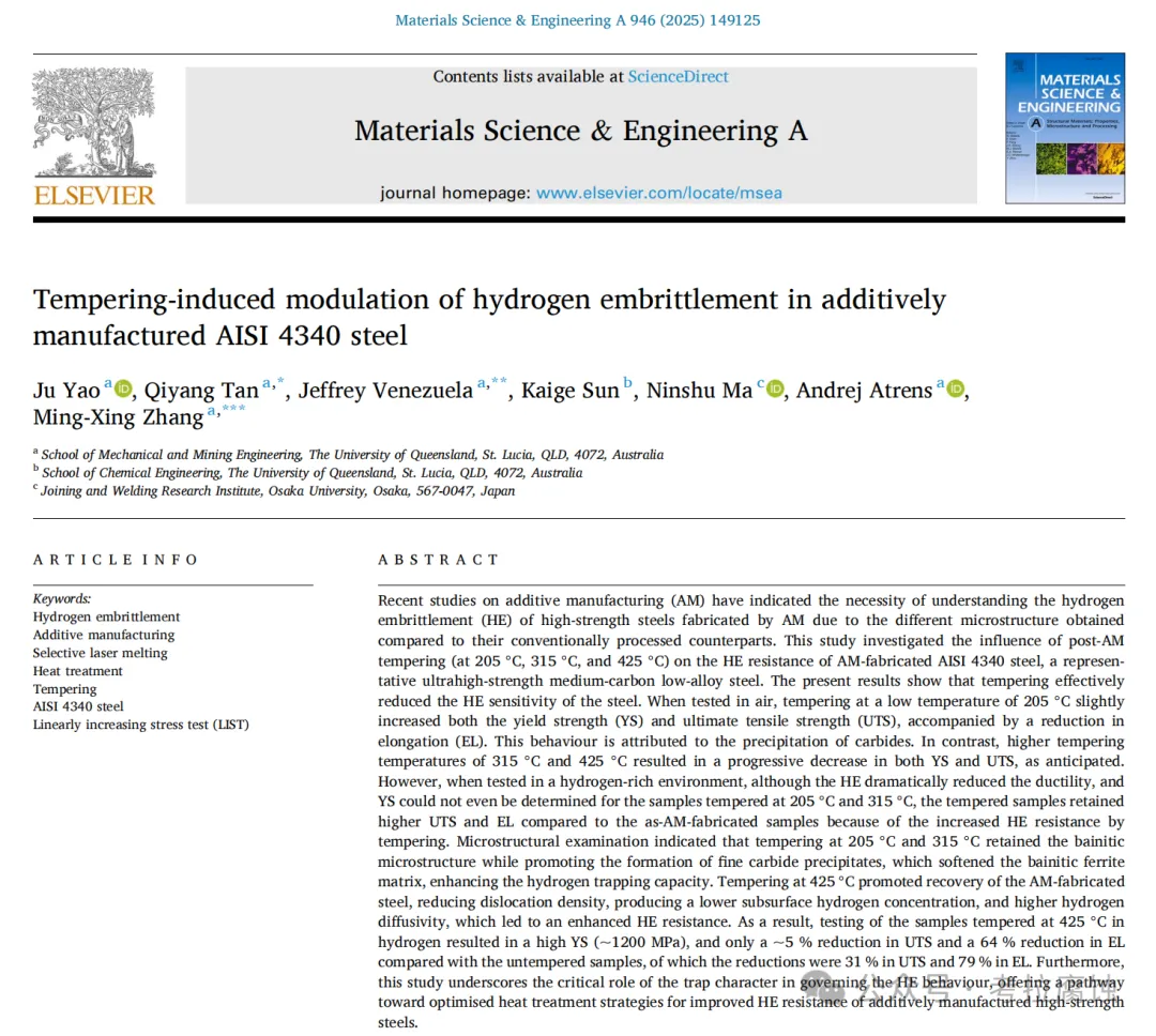 近日,昆士兰大学研究团队在国际知名期刊Materials Science and Engineering: A 上发表最新成果,系统研究了 AM 制备的 AISI 4340 钢在不同回火温度(205 ℃,315 ℃ & 425 ℃)下的氢脆行为。研究发现: