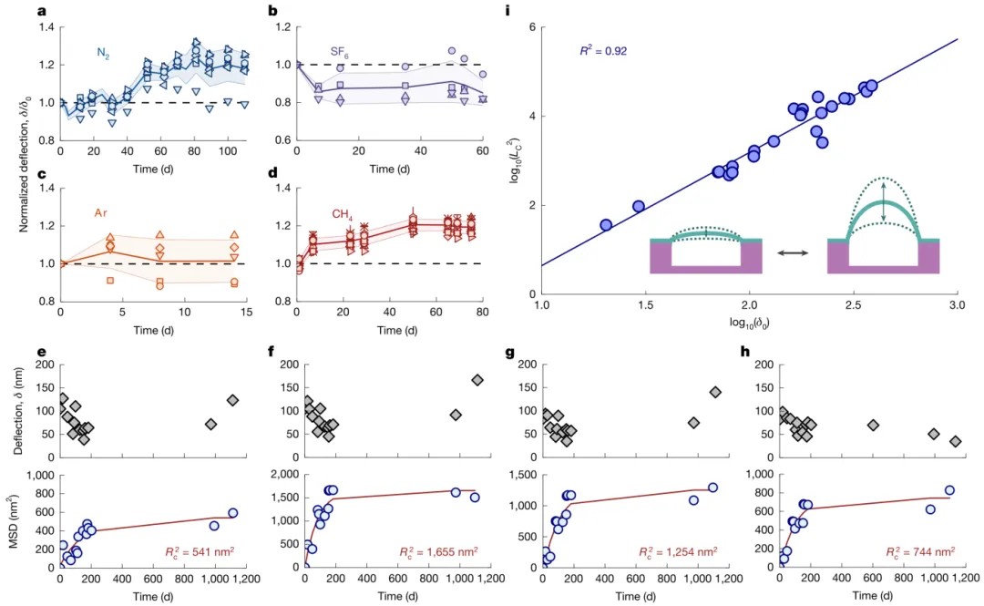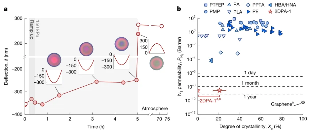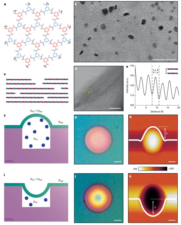 传统聚合物因链间自由体积存在,均具有气体渗透性,即使自由体积最小的液晶聚合物,氮气渗透率也仅约 10⁻⁵ Barrer;而石墨烯等二维材料因紧密堆积无自由体积,可实现分子级阻隔,但需高温生长且手动转移,限制了其作为阻隔材料的应用。溶液合成具有分子阻隔性的二维聚合物,既能结合传统聚合物的可加工性,又能兼具二维无机材料的低渗透性,是长期以来的研究目标。 近日,麻省理工学院 Michael S. Strano教授、波士顿大学 J. Scott Bunch教授(共同通讯作者)合作成功制备出了一种自支撑的二维聚芳酰胺纳米膜,其氮气渗透性低于3.1×10⁻⁹ Barrer,比现有所有聚合物低近四个数量级,并对氦气、氩气、氧气、甲烷和六氟化硫等多种气体表现出同样优异的阻隔性能。该材料不仅可用于制造高频谐振器,还能作为超薄保护层显著延缓空气敏感钙钛矿材料的降解,展现出广阔的应用前景。 2025年11月12日,相关论文以“A molecularly impermeable polymer from two-dimensional polyaramids”为题发表在Nature上。 图文介绍 首先合成了名为2DPA-1的二维聚芳酰胺材料,并将其分散后旋涂成纳米薄膜。图1展示了2DPA-1纳米片的结构与形貌:理论模型揭示了其单层片状结构与层间紧密堆积的特性;透射电子显微镜图像显示纳米片直径约为10纳米,均匀分散于石墨烯支撑的网格上;扫描透射电子显微镜进一步证实了薄膜具有层状有序排列,层间距为 3.3 ± 0.2埃。当这些薄膜被转移到硅基微孔阵列上时,可形成向上凸起或向下凹陷的稳定结构,其偏转高度可通过原子力显微镜精确测量,显示出优异的机械强度和界面密封性能。 图1. 2DPA-1 的结构与薄膜鼓泡特性。a. 为 2DPA-1 单层纳米片理论结构;b. 为 TEM 下分散在石墨烯支撑网格上的 2DPA-1 纳米片;c. 为 2DPA-1 薄片理论结构(含少量空隙);d. 为 STEM 下旋涂薄膜边缘的 2DPA-1 薄片排列;e. 为 d 图的强度分布;f、i. 为薄膜挠度横截面示意图(f 为正向鼓泡,i 为负向凹陷);g、j. 为正向鼓泡和负向凹陷的光学显微镜图;h、k. 为 g、j 对应的 AFM 图及挠度剖面。 为了验证其分子不可渗透性,利用微孔凸起实验进行了长期气体阻隔测试。图2记录了在氮气加压条件下,薄膜从初始凹陷状态逐渐充气形成稳定凸起的动态过程。光学干涉技术使研究人员能够实时追踪薄膜偏转变化,发现即使在110天内,充有150 kPa氮气的凸起也未发生明显泄气。通过计算,2DPA-1薄膜的氮气渗透性上限被确定为3.1×10⁻⁹ Barrer,接近完美石墨烯的阻隔水平,且远低于所有已知液晶聚合物。 图2. 氮气渗透性测量与凸起持久性。a. 为 2DPA-1 凹陷在氮气加压前后的挠度变化(白色点为 AFM 数据,红色点为光学干涉数据)及不同时间的鼓泡剖面;b. 为氮气渗透率与结晶度的关系(含多种传统聚合物数据对比)。 除了氮气,该材料对六氟化硫、氩气和甲烷等其他气体也表现出类似的不可渗透性。图3显示了这些气体所形成的凸起在长时间内偏转仅出现微小随机波动,均方位移分析表明其行为符合受限扩散模型,进一步证实气体并未透过薄膜逸出。特别值得注意的是,这些凸起在长达三年内仍保持稳定,说明2DPA-1材料不仅本身无渗透路径,还不会因吸湿或物理老化而丧失屏障功能。 图3. 不同气体凸起偏转随时间的随机波动。 a-d. 为氮气、六氟化硫、氩气、甲烷填充鼓泡的归一化挠度随时间变化;e-h. 为 4 个 2DPA-1 鼓泡挠度的均方根位移(MSD)分析;i. 为初始挠度对数与约束长度平方对数的线性关系。 在实际应用方面,图4展示了2DPA-1在纳米机电系统和光伏封装中的潜力。通过调控合成过程中芳环与端基的比例,可制备出具有不同尺寸和机械强度的纳米片,其中大尺寸纳米片能形成均匀稳定的悬浮薄膜。这些薄膜在真空中表现出高达8 MHz的共振频率和537的品质因子,媲美石墨烯谐振器。此外,将60纳米厚的2DPA-1涂层旋涂于甲基铵铅碘钙钛矿表面,可将其在空气中的降解时间从3天延长至21天,相当于将晶格降解速率降低了14倍。通过降解动力学模型推算出其氧气渗透性为3.3×10−8Barrer,再次验证了其作为高效屏障材料的可行性。 图4. 2DPA-1的实际应用拓展。a. 为芳香族与端基比例(r)与芳香族偏斜度(s)的关系;b. 为 2DPA-1 薄膜作为纳米机电谐振器的示意图;c. 为 35 nm 厚 2DPA-1 谐振器的功率谱密度;d. 为 2DPA-1 旋涂封装 MAPbI₃的示意图;e. 为未涂覆 2DPA-1 的 MAPbI₃在空气中的 XRD 谱图(随时间变化);f. 为涂覆 60 nm 2DPA-1 的 MAPbI₃在空气中的 XRD 谱图(随时间变化)。 总之,论文创新性主要体现在三方面:①突破传统聚合物阻隔性能瓶颈:首次通过溶液相缩聚合成具有分子级阻隔性的二维聚芳酰胺(2DPA-1),氮气渗透率低于 3.1×10⁻⁹ Barrer,比现有最低渗透聚合物低近四个数量级,性能比肩石墨烯,同时保留传统聚合物的溶液可加工性,解决二维无机材料难加工、需高温生长的问题;②揭示新型阻隔机制:提出 “交错堆积 + 位阻能垒” 协同机制,通过薄片交错堆积减小有效孔径,结合高传输能垒抑制气体分子穿越,而非依赖传统聚合物的高结晶度,且通过调控端基比例(r)可实现薄膜机械稳定性与阻隔性的精准匹配;③拓展二维聚合物应用场景:首次将二维聚芳酰胺用于纳米机电谐振器(品质因数达 537)和钙钛矿封装(降解速率降低 14 倍),证实其在高频器件、光电子防护等领域的实用价值,为下一代阻隔材料与功能器件设计提供新范式。 原文链接 https://doi.org/10.1038/s4