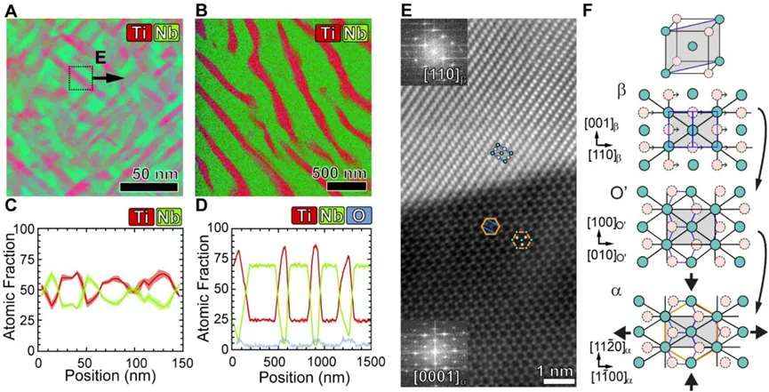 通过向等摩尔的TiNb合金中引入约1%原子比的间隙氧,并结合800℃的特定热处理,成功诱导合金从初始均一的体心立方(BCC)相发生相分解,形成两种关键纳米结构:一是Ti/Nb富集的调幅结构,其成分呈周期性波动,周期为40-100nm,二是富Ti六方相(α-HCP)和富Nb BCC相交替的层状结构。