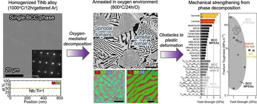 近日美国加州大学研究人员向等摩尔的TiNb合金中,加入了大约1%原子比的氧,再通过特定热处理让合金内部发生“相分解”,使合金抗拉强度超2GPa,同时保持约8MPa·m0.5的中等断裂韧性。相关研究结果以“Interstitial-Mediated Spinodal Decomposition Pathways Leading to Strengthening in TiNb”为题被发表在期刊《Acta Materialia》上。