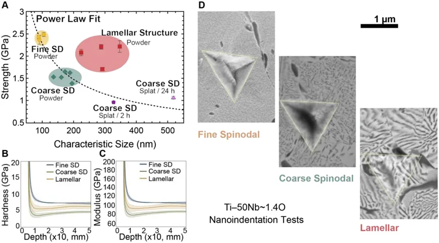 合金的抗拉强度超过了2GPa,其中细调幅结构能达到2.43GPa,是原始均一BCC相合金的3倍。另外,合金的硬度达到了6.2GPa,同时保持了约8MPa·m0.5的中等断裂韧性。该材料在纳米压痕测试测试下无脆性开裂现象且塑性变形均匀,强度方面比多数含和不含氧的BCC多主元合金和传统钛基合金都更好。
