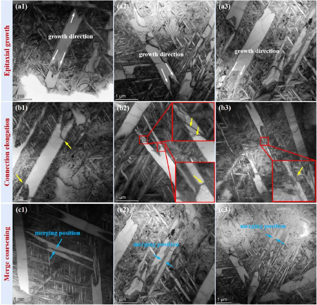 三种样品的微观结构呈现出明显差别,H1组织以时效过程中析出的细小次生α相为主;H2组织发展出较为连续的中尺度α层片,初生α形貌趋于规则;而H3组织最为特别,具体表现为形成了叉状结构,结构特征是多个方向一致的α层片在端部合并、延伸并产生分叉形态,该结构的形成来源于α层片的外延生长、相邻层片的连接延伸以及同向层片的合并粗化。
