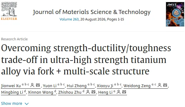 近日,材料领域权威期刊《Journal of Materials Science & Technology》在线发表了一篇题为“Overcoming strength-ductility/toughness trade-off in ultra-high strength titanium alloy via fork + multi-scale structure”的研究成果,该论文的研究团队基于TB17钛合金体系,通过设计三步热处理工艺,在材料中构建出独特的“叉状(forked)+ 多尺度(multi-scale)”复合组织,使合金在实现1378MPa拉伸强度、8.6%延伸率的同时还兼具81 MPa·m1/2断裂韧度,有效突破了长期困扰钛合金设计的强-塑-韧性能权衡难题。通讯作者为中航工业北京航空材料研究院朱知寿研究员和西北工业大学凝固技术全国重点实验室的徐建伟副研究员、曾卫东教授和李恒教授。