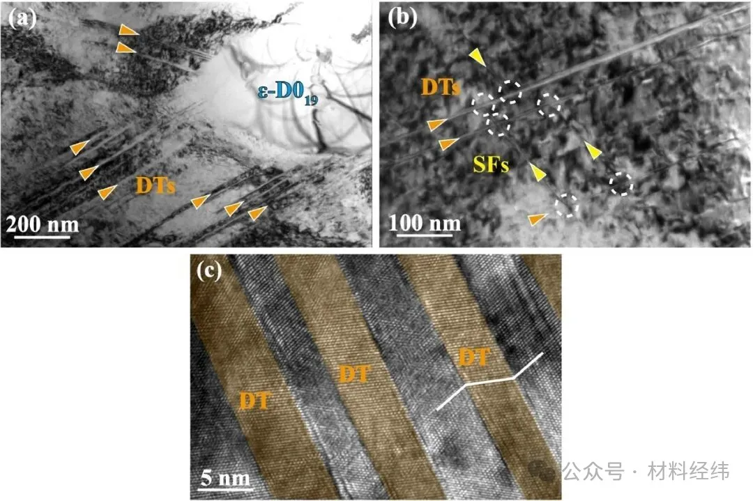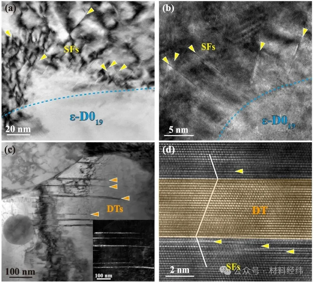 室温变形时,新合金中的D0₁₉析出相因尺寸较大、与基体结合强,位错难以“切过”,主要采取 “绕过”机制,在颗粒周围形成位错环。这带来了显著的奥罗万强化效应。同时,基体内形成高密度层错与缠结位错,共同贡献了高强度与良好的加工硬化能力。