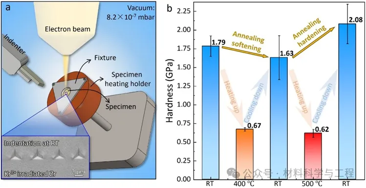 图1. 辐照与退火后锆的硬度变化。 (a) 在高真空腔室内使用原位纳米压痕进行硬度测试的方法示意图。左下角插图为纳米压痕后辐照纯锆的扫描电子显微镜图像。(b)离子辐照后的纯锆在400°C和500°C退火30分钟前后的硬度变化。