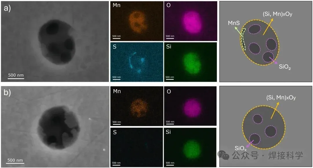2025年11月27日,比利时布鲁塞尔自由大学可持续材料工程研究小组的研究团队在《Corrosion Science》期刊发表最新研究文章“Role of non-metallic inclusions in the initiation and propagation of corrosion in wire arc additive manufactured low-alloy steel”,研究了电弧增材制造(WAAM)低合金钢在海洋环境中的早期腐蚀行为,重点探究了非金属夹杂物对腐蚀萌生和扩展机制的影响。 该研究探究了电弧增材制造(WAAM)低合金钢的早期腐蚀行为。研究人员将试样暴露于海洋环境中,考察了非金属夹杂物对腐蚀的影响。尽管由于快速凝固,锰硅酸盐在增材制造钢中较为常见,且在某些增材制造钢种(如不锈钢)中通常被认为对腐蚀呈惰性,但在该研究的WAAM低合金钢中,这些夹杂物可能含有富MnS的微小区域。由于其化学不稳定性,这些富MnS区域成为点蚀萌生的优先位点。随着在海洋环境中暴露时间的增加,富MnS区域周围的金属基体发生局部溶解,导致夹杂物脱落和点蚀形成,随后形成周围的圆形腐蚀前沿。该前沿逐渐扩展,包裹并脱落相邻的夹杂物,最终从局部腐蚀转变为全面腐蚀。 实验方法 该研究以ER90S-G焊丝通过电弧增材制造(WAAM)制备的低合金钢为研究对象,其化学组成包含C、Si、Mn、Cr、Mo、V等元素,Fe为基体元素。采用扫描电子显微镜(SEM)、电子背散射衍射(EBSD)、能谱仪(EDS)、扫描开尔文探针力显微镜(SKPFM)、电流传感原子力显微镜(CSAFM)对材料的微观结构、夹杂物的分布、尺寸、形态及化学成分等进行表征;通过动电位极化试验对比WAAM钢与传统锻造钢的耐腐蚀性;采用3.5wt%NaCl溶液模拟海洋环境进行浸泡试验,探究不同浸泡时间(30秒、1分钟、5分钟、30分钟)下的腐蚀萌生与扩展过程;借助微毛细管技术,在施加0.2%拉伸应变的条件下进行应力辅助腐蚀试验,观察裂纹萌生情况。 论文图片 图1.(a)WAAM沉积过程的示意图,突出显示了扫描策略;(b)用于材料分析的试样提取方式。 图2.(a)显示WAAM试样中夹杂物分布的场发射扫描电子显微镜(FE-SEM)图像;(b)夹杂物数量与其直径的关系图。 图3.WAAM制备的ER90S-G钢中的典型夹杂物,由(Si,Mn)ₓOᵧ组成:(a)含有微小MnS区域的夹杂物;(b)未检测到硫含量的夹杂物。示意图中标注了已识别的区域:SiO₂、(Si,Mn)ₓOᵧ和MnS。 图4.传统钢和WAAM钢试样在0.1M NaCl溶液中的动电位极化曲线。 图5.(a)在3.5wt%NaCl溶液中浸泡30秒后的扫描电子显微镜(SEM)图像,可见夹杂物处的腐蚀萌生。表格总结了所分析的夹杂物及出现点蚀的夹杂物情况;(b)点蚀密度随在3.5wt%NaCl溶液中浸泡时间的变化关系。 图6.试样在3.5wt%NaCl溶液中浸泡30秒后不同区域的扫描电子显微镜(SEM)图像,展示了腐蚀的初始阶段:(a)夹杂物周围的点蚀萌生;(b)通过夹杂物相邻钢基体的溶解导致点蚀加深;(c)夹杂物脱落。注:在30秒的浸泡时间内,同一试样上已能观察到这三个阶段。 图7.试样在3.5wt%NaCl溶液中浸泡30秒后的扫描电子显微镜(SEM)图像,展示了局部腐蚀形成的早期阶段:(a)黄色大箭头指示腐蚀前沿的形成,白色虚线圆圈突出显示尚未发生腐蚀的夹杂物;(b)点蚀中心的放大图,捕捉到特定夹杂物处的腐蚀萌生以及被腐蚀前沿触及并开始脱落的夹杂物。 图8.试样在3.5wt%NaCl溶液中浸泡30秒后的扫描电子显微镜(SEM)图像,显示腐蚀始于含硫夹杂物的点蚀中心(通过能谱仪(EDS) mappings确认)。 图9.在3.5wt%NaCl溶液中浸泡试验后局部腐蚀萌生和扩展的图像,按浸泡时间分组:(a,b)30秒;(c,d)1分钟;(e,f)5分钟;(g,h)30分钟。每个时间间隔均同时呈现低倍和高倍图像,左侧为低倍图像,右侧为高倍图像。 图10.含三个所研究夹杂物区域的电子背散射衍射(EBSD)分析:(a)场发射枪扫描电子显微镜(FEG-SEM)图像;(b)同一区域的晶粒平均取向差(KAM)图。 图11.通过场发射扫描电子显微镜-能谱仪(FE-SEM-EDS)(1)、形貌图(2)、伏特电位图(3)、电流图(4)以及线扫描图谱(5)对夹杂物进行的分析(通过扫描开尔文探针力显微镜(SKPFM)和电流传感原子力显微镜(CSAFM)获得):(a)未检测到硫含量的夹杂物;(b)含有MnS的夹杂物。 图12.利用FactSage软件计算得到的298.15K下Mn-S-H₂O体系的Pourbaix图(电位-pH图)。 图13.场发射扫描电子显微镜(FE-SEM)图像,展示了试样在3.5wt%NaCl溶液中浸泡后施加拉伸载荷的腐蚀形貌和裂纹形成情况,浸泡时间分别为:(a)30秒;(b)5分钟;(c)30分钟。 图14.WAAM制备的低合金钢在NaCl溶液中浸泡后早期腐蚀阶段的示意图。左侧图示为俯视图,右侧图示为横截面图。从上到下,依次展示了浸泡时间的推移过程,突出显示了试样中不同类型夹杂物的存在,腐蚀始于含MnS的区域,并通过腐蚀前沿的扩展向其他夹杂物蔓延。 论文总结 该研究探究了电弧增材制造(WAAM)制备的ER90S-G钢中夹杂物在海洋环境下对腐蚀萌生和早期扩展的影响,得出以下结论: (1)该材料中的夹杂物尺寸细小且呈圆形,尺寸小于1μm(近90%的颗粒小于500nm),均匀分布于整个试样中。这些夹杂物主要为(Si,Mn)ₓOᵧ,部分还含有硫元素,表明存在MnS。 (2)腐蚀主要始于含MnS的夹杂物,点蚀优先在这些位置萌生并最终导致夹杂物从金属基体脱落。尽管并非所有夹杂物都是优先腐蚀位点,但一旦含MnS的(Si,Mn)ₓOᵧ夹杂物处形成点蚀,就会发展出圆形腐蚀前沿,并向周围先前未受影响的颗粒扩展,这些颗粒随后成为活性腐蚀位点并依次脱落。 (3)在MnS区域与周围的(Si,Mn)ₓOᵧ或金属基体之间未检测到显著的伏特电位差,且MnS表现出非导电行为。这是由于在该材