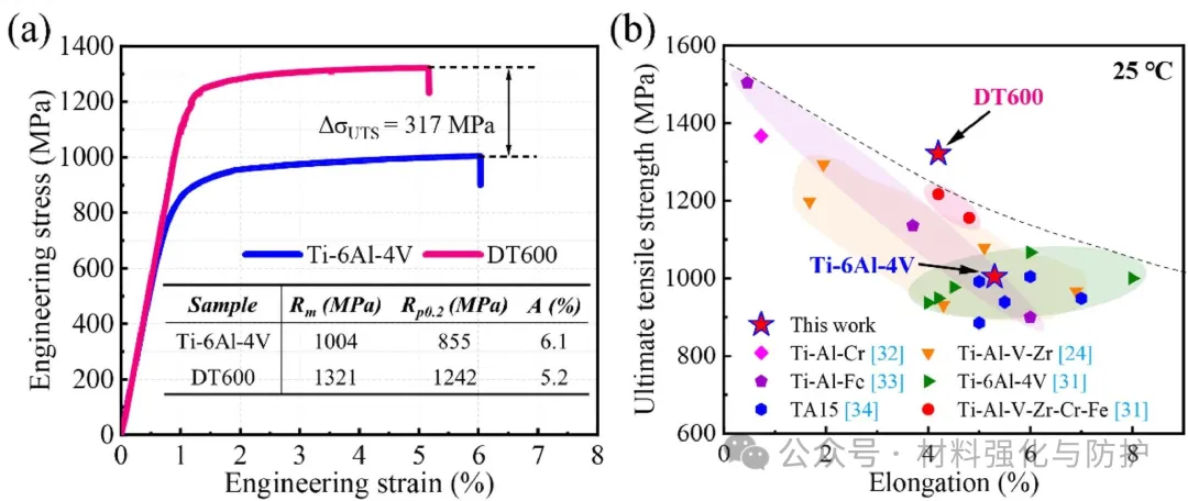 DT600在室温下具有1242MPa的屈服强度和1321MPa的抗拉强度,分别较Ti-6Al-4V提升45%和31%。在500-600℃范围内DT600的强塑协同性较目前已报道的一些常规钛合金体系具有明显优势,600℃时,DT600屈服强度(623MPa)是Ti-6Al-4V的1.7倍,同时延伸率高达46.2%。在强韧性机制方面,塑性的提升归因于动态球化机制的激活,强度提升源于固溶强化(Zr、Mo、Nb贡献268MPa)、α/β相细化(693MPa)及硅化物沉淀(59MPa),且高温下硅化物钉扎界面,有效延缓软化。