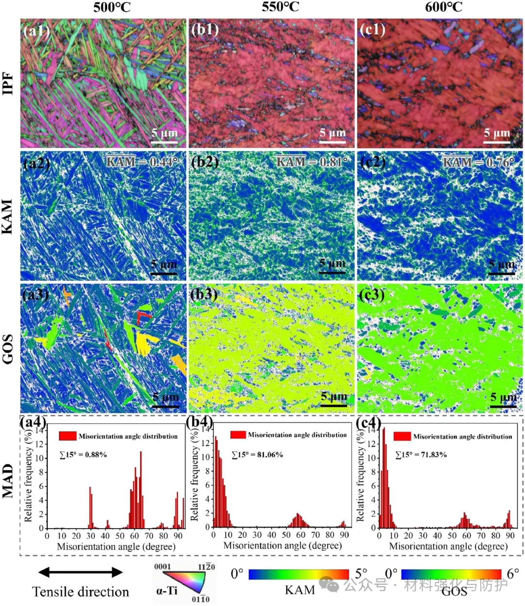 在550℃以上,DT600的α板条动态球化,形成尺寸50-100nm的亚晶,EBSD显示,550℃时低角度晶界比例增至81%,且合金在550℃变形时α板条分裂为等轴晶,硅化物抑制板条粗化,600℃时β相渗入α板条,加速球化过程。变体晶界分析表明,DT600中α变体通过自协调机制形核,因此诱发形成网篮组织和弱纹理,优化合金的高温性能。