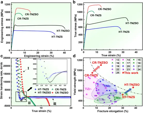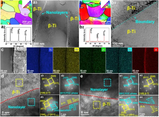 导读:由于其卓越的机械性能和生物相容性,β-Ti合金在生物医学领域引起了广泛关注。然而,同时提升屈服强度和延展性仍是一个持续的挑战,限制了其更广泛的应用。本研究中,我们仅将0.3 wt.%的间隙氧原子引入β型Ti-35Nb-9Zr-7Sn合金,诱导晶界处的局部化学有序(LCO)和面心立方(FCC)纳米层,显著提升了原均质和輯成试样的屈服强度和伸长性。通过将平面位错滑移转化为波状滑移,粒内LCO结构促进双重交叉滑移和位错倍增,共同增强应变硬化行为。与此同时,间隙中由氧驱动的FCC相纳米层促进位错在晶界上滑移,进一步提升延展性。这种以氧气为驱动的策略克服了传统的强度与延展性权衡,为设计下一代承载生物医学β-Ti合金提供了有前景的道路。 对长寿、健康和高生活质量的追求持续推动了对先进生物医学材料的需求,尤其是那些用于修复或替换病变组织和器官的材料。金属生物材料因其独特的高强度、可加工性、耐用性和良好的血液相容性而成为承重医疗设备的重要组成部分。虽然不锈钢和钴基合金曾被广泛使用,但由于其高弹性模数带来的有毒离子释放和应力屏蔽效应的担忧,其临床应用已被限制。 由于镁(Mg)基和钛(Ti)基金属生物材料弹性模量低且在人体条件下生物相容性更佳,其应用代表了减少应力屏蔽效应的两大主要途径。镁基合金因其在生理环境中的快速腐蚀速度,成为新一代可生物降解生物材料的革命性应用,这可能消除修复后移除植入物组件的必要。然而,镁基合金的主要限制在于其在生理条件下的快速腐蚀,导致氢气快速释放。相比之下,钛合金具有稳定的长期机械性能、优异的耐腐蚀性和可靠的生物相容性,使其特别适合永久或长期承载应用。因此,虽然Mg合金为临时植入物提供了独特优势,钛合金仍是开发下一代生物医学材料以实现持续承载应用的更坚实基础。 在各种钛合金中,β-Ti合金的弹性模量与皮层骨高度匹配,有效减轻了应力屏蔽,降低了植入物修复的风险。研究最深入的生物医学β-Ti系统包括基于Ti-Zr的、基于Ti-Mo的Ti-Nb-based 以及基于Ti-Ta的合金。例如,Ozan 等人制造了一种β型 Ti-Nb-Zr 合金,杨氏模数为 62 GPa,其细胞存活率高于对照组,具有优异的细胞相容性。Bertrand 等人合成了一种β型 Ti-Ta-Nb 合金,杨氏模量为 55 GPa,Ti-Ta-Nb 合金在腐蚀和离子释放率方面低于商业纯钛。尽管有这些优势,大多数生物医学β-Ti合金仍无法满足医疗金属植入物的长期应用要求。这主要归因于通过亚稳态相诱导马氏体转变提升了延展性和极限拉伸强度,但它们通常表现出较低的屈服强度(通常低于400兆帕),限制了其长期承载性能。由于屈服强度决定材料对塑性变形的抵抗力及其服役可靠性,开发同时提升屈服强度和延展性的β-Ti合金已成为合金设计中的核心挑战。 解决这一挑战的努力通常包括增加β稳定元素数量以抑制马氏体转变,从而提升屈服强度。然而,这些方法通常会提高屈服强度,同时降低延展性。作为替代方案,间隙强化因其效率和可扩展性而备受关注 。在间隙溶质中,氧是钛合金中研究最广泛的元素,已知通过与位错的强烈排斥作用显著提升屈服强度,即使在微量水平下.然而,通过增加氧含量显著增强的强度,也伴随着延展性的严重下降。 近期研究为氧原子在强化和增强金属材料中的机制提供了新的见解。例如,Lu等人发现高熵合金中可以形成有序氧配合物,从而提升机械性能和延展性。Wang 等人证明,将富含氧气的 FCC Ti 相纳入 Ti-6Al-4 V 可显著提升屈服强度,同时不影响延展性。同样,Chong等人指出,沿晶界稀释的氧分离可能促进钛合金的强度-延展性协同。这些发现表明,尽管氧气在合金设计中仍是一把双刃剑,但其效应高度可调,取决于其分布及与金属基体的相互作用。因此,在钛合金冶金加工中,精确控制氧含量及其空间分布对于优化拉伸屈服强度和延展性至关重要。 基于这一理解,本研究向Ti-35Nb-9Zr-7Sn(以比重百分比,除非特别说明)生物医用β-Ti合金中引入0.3 wt. %的间质氧,并提出了一种氧驱动的双相纳米结构调控策略。通过这种方法,原均质合金和轧制合金同时实现屈服强度和断裂伸长的提升,有效打破了传统的强度与延展性权衡。微观结构分析显示,颗粒内氧促进液氧,将位错滑移从平面模式转变为波状模式,从而实现多次交叉滑移事件并增强应变硬化能力。同时,晶界处的氧分离导致富氧的FCC纳米层形成,促进跨粒位错运动,进一步增强延展性。本研究系统阐明了间隙氧在调节β-Ti合金颗粒内和晶界结构中的双重作用,为克服强度-延展性困境提供了可行路径,并指导先进高性能生物医学钛合金的发展。 该研究以Simultaneous enhancement of strength and ductility of biomedical β-type Ti-35Nb-9Zr-7Sn alloy through oxygen-driven local chemical ordering and grain boundary nanolayers发表在Acta Materialia 图 1 本研究中生物医用β-Ti合金制备流程图。 图 2 HT-TNZSO和HT-TNZS合金的微观结构特性。 图 3 HT-TNZSO合金中界面纳米层的3D-APT及球形像差校正TEM微观结构。(a)3D-APT实验前样品的TEM图像;(b)利用3D-APT重建的原子图谱;(c)对应于(b)黄色线的组成剖面;(d)沿[011]的界面纳米层的STEM-HADDF图像联邦通信委员会区轴;(e) 界面纳米层的STEM-ABF图像;(f) (e)中红色方块的放大图像,显示FCC晶体结构。白色箭头突出显示FCC晶格中的氧原子柱。 图 4 HT-TNZSO合金中β-Ti基体的球像差校正TEM微观结构。(a1)沿[110