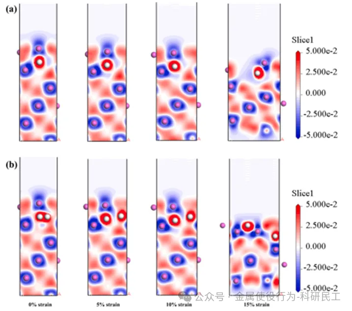 图4. 铝在拉伸应变下的应变电荷密度分布:(a) 含有一个氢原子,(b) 含有两个氢原子。
