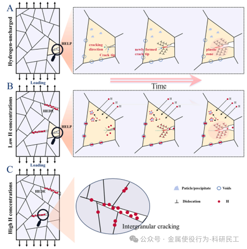 图5. 7xxx铝合金在不同环境下的氢脆机制示意图:(A) 未充氢环境,(B) 低氢浓度环境,(C) 高氢浓度环境。