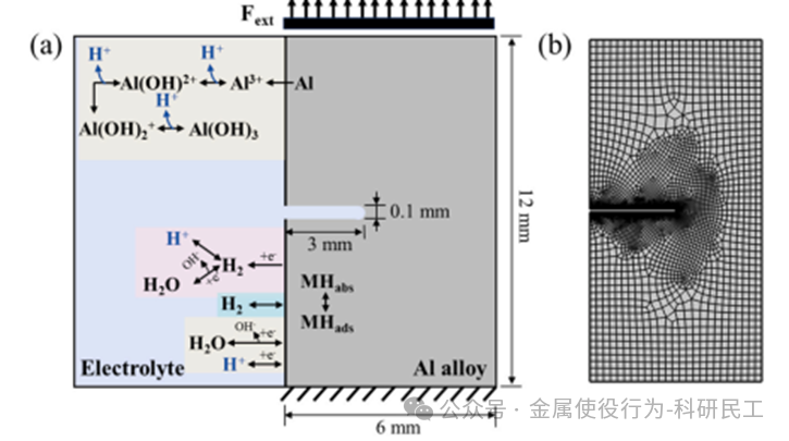 图2. (a) 带裂纹的7xxx铝合金几何模型,(b) 有限元模型网格划分。