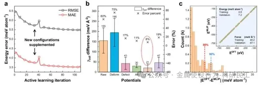 - 主动学习实现“势函数的自我进化”:MLIP在模拟过程中自动识别不确定性高的新原子构型(如高温、大应变、界面),将其返回给DFT计算并扩充训练集。这使得势函数能主动探索并学习相变路径上的未知区域,而非被动拟合已知数据。